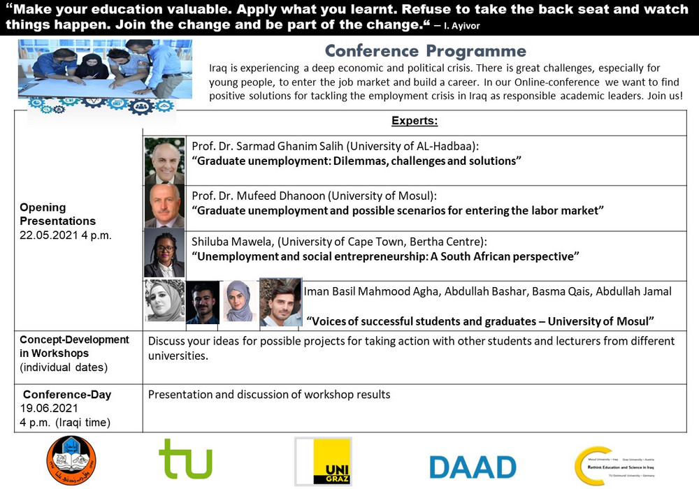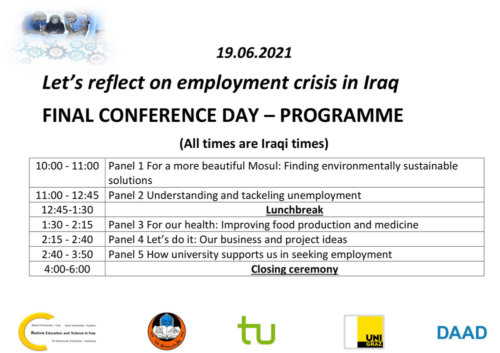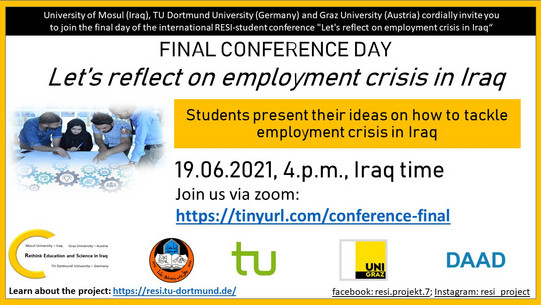University of Mosul, TU Dortmund University and Graz University cordially invite you to join the final day of the international RESI-student conference "Let's reflect on employment crisis in Iraq".